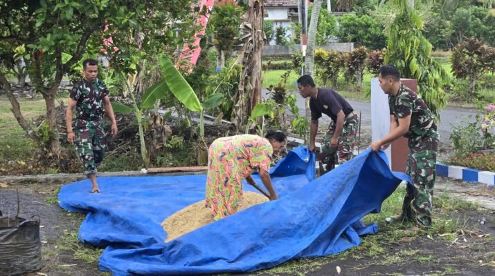 Satgas TMMD Menunjukkan Aksi Gotong Royong Bantu Warga Menyelamatkan Hasil Panen Padi Dari Turun Hujan