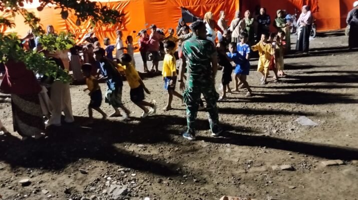 Babinsa dan Relawan Gelar Permainan Edukatif untuk Pulihkan Psikis Anak-Anak Pengungsi di Pronojiwo.