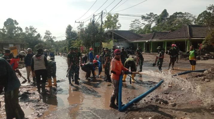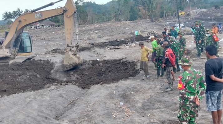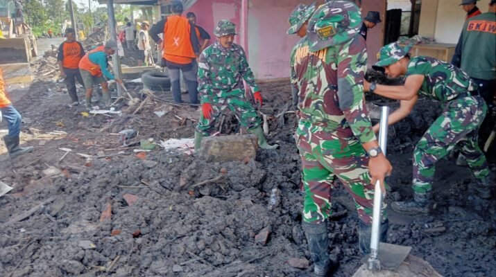 Pulihkan Permukiman, Personel TNI dan Relawan Evakuasi Material Vulkanik di Gumukmas. Lumajang — Upaya pemulihan pascaerupsi Gunung Semeru terus dilakukan secara intensif oleh jajaran