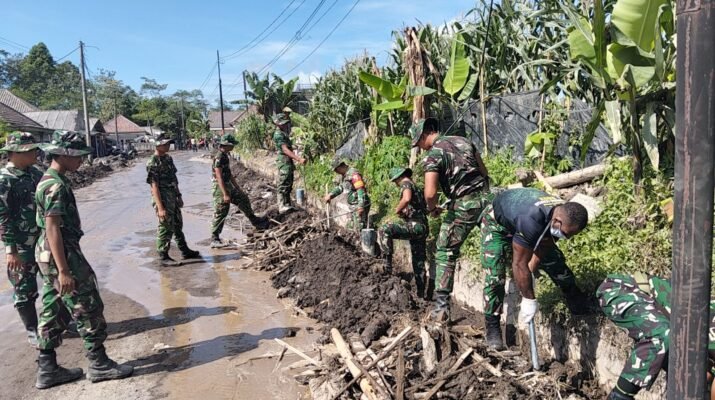 Personel Gabungan Kodim 0821 dan Yonif 527/BY Bersihkan Selokan di Jalur Vital Supiturang. Lumajang — Personel gabungan Kodim 0821/Lumajang bersama Yonif 527/BY, di bawah