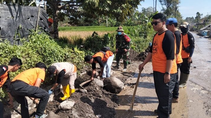 Anggota Kodim 0821 Lumajang Dipimpin Peltu M. Sholeh Bersihkan Material Vulkanik di Desa Supit Urang