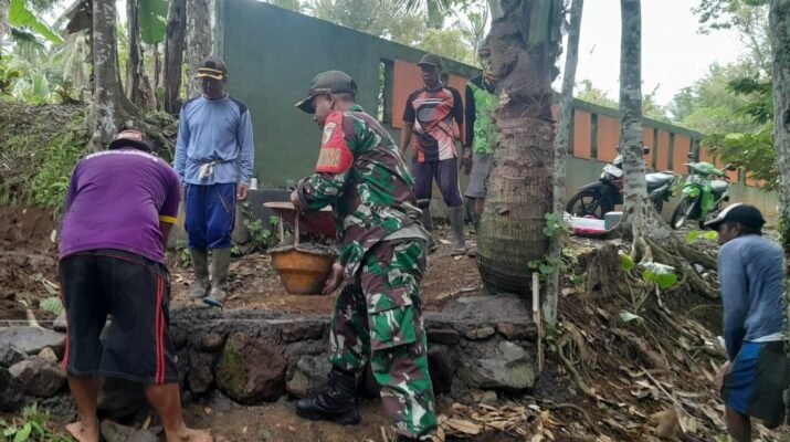 Songgon – Mengantisipasi ancaman erosi dan longsor di musim penghujan, Babinsa Koramil 0825/20 Songgon memimpin aksi nyata bersama warga Dusun Sumberrejo dalam karya bhakti pembuatan pondasi dan pelengsengan jalan pertanian, Rabu (19/11/2025). Kegiatan yang berlangsung sejak pukul 07.10 WIB ini menjadi jawaban konkret atas keresahan petani yang selama ini kesulitan mengakses lahan pertanian mereka, terutama saat musim hujan tiba. Dengan semangat gotong royong yang mengakar kuat, puluhan warga bergabung dengan personel TNI untuk membangun infrastruktur vital yang akan menjadi penopang ekonomi masyarakat desa.