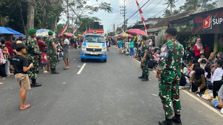 Pasukan Satgas TMMD Turun Langsung Bantu Pengamanan Karnaval di Siliragung Siliragung – Karnaval peringatan HUT RI ke-80 di Kecamatan Siliragung berlangsung meriah dengan antusiasme