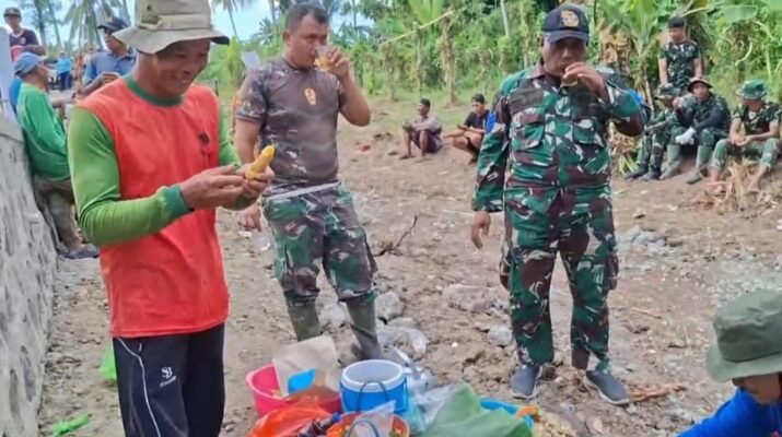 Satgas TMMD ke-125 Kodim 0825/Banyuwangi Humanis dengan Warga di Sela Istirahat Banyuwangi – Kehangatan kebersamaan antara Satgas TNI Manunggal Membangun Desa (TMMD) ke-125 Ta.