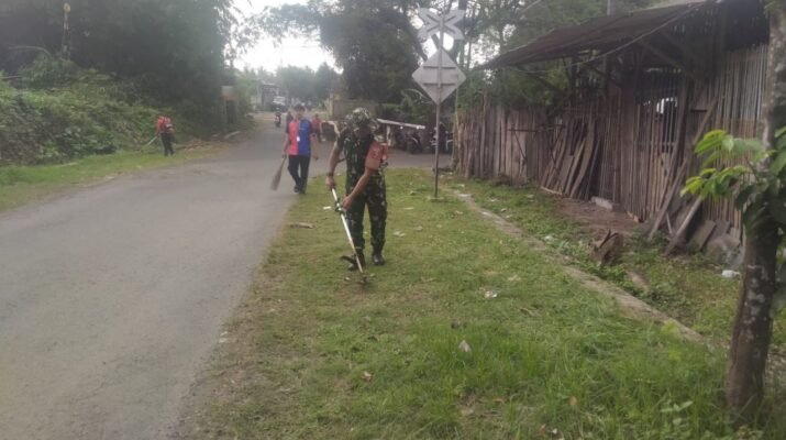 Babinsa Koramil Rogojampi Gandeng Warga Timurejo Bersihkan Rumput Liar di Bahu Jalan