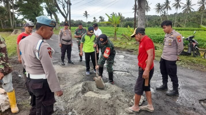 Songgon — Komandan Koramil 0825/20 Songgon, Kapten Kav Andoko, membuktikan komitmen nyata membangun infrastruktur daerah dengan memimpin langsung kegiatan kerja bakti penembelan jalan berlubang