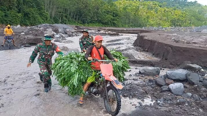 Lumajang – Di tengah cuaca yang tidak menentu dan aktivitas lahar dingin yang masih terjadi pasca-erupsi Gunung Semeru, Personel TNI kembali menunjukkan komitmen kemanusiaan mereka. Dengan penuh dedikasi, para personel membantu warga yang kesulitan melintasi jalur terdampak material vulkanik di wilayah rawan bencana, Jumat (28/11/2025).
